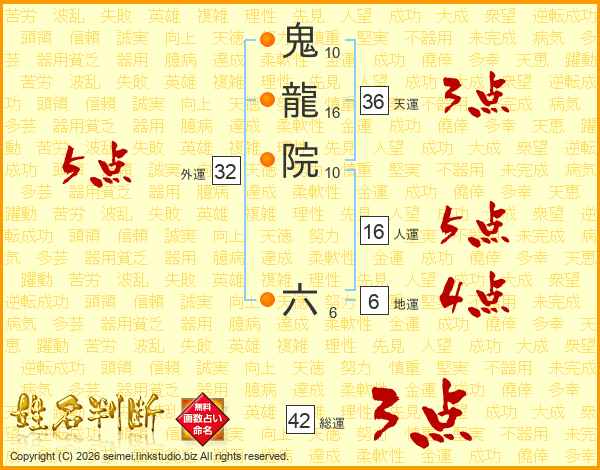 鬼龍院六さんの総運は42画の3点!