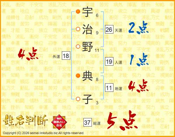 宇(6画)治(9画)野(11画) 典(8画)子(3画)