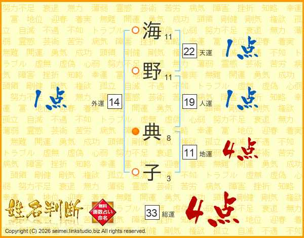生活面を象徴する運勢です。外部から受ける影響力を表し、結婚運、家庭運や職場、環境への順応性を表します。総運から人運を引いた画数。姓や名が1文字の場合を除く。