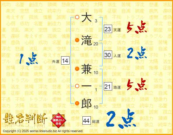 大(3画)滝(20画) 兼(10画)一(1画)郎(10画)