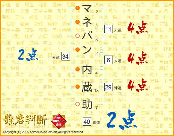 マ(2画)ネ(4画)パ(3画)ン(2画) 内(4画)蔵(18画)助(7画)