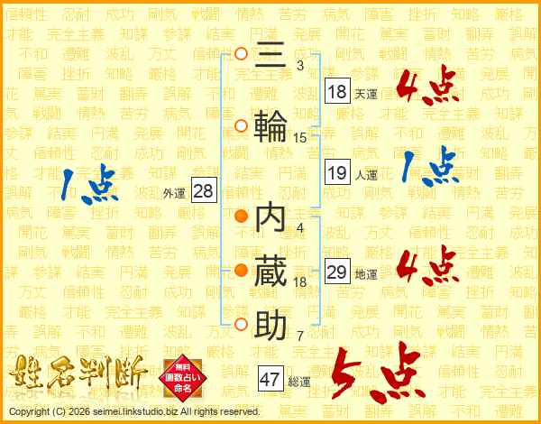 三(3画)輪(15画) 内(4画)蔵(18画)助(7画)