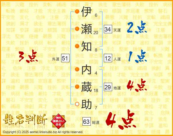 伊(6画)瀬(20画)知(8画) 内(4画)蔵(18画)助(7画)