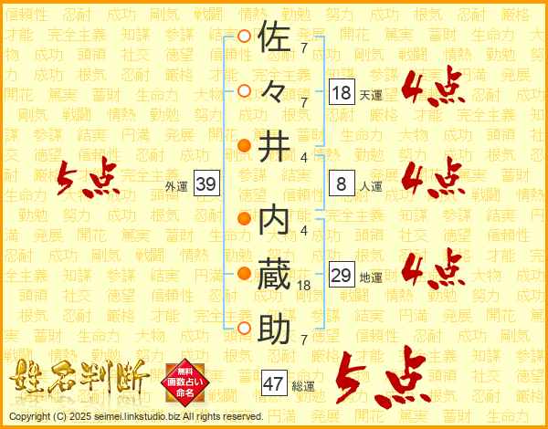 佐(7画)々(7画)井(4画) 内(4画)蔵(18画)助(7画)