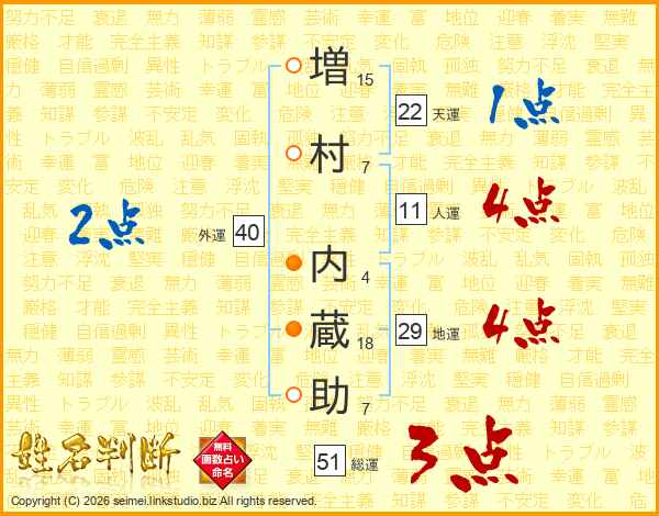 増(15画)村(7画) 内(4画)蔵(18画)助(7画)