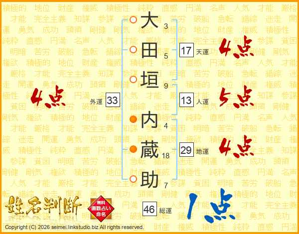 大(3画)田(5画)垣(9画) 内(4画)蔵(18画)助(7画)