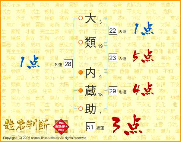 大(3画)類(19画) 内(4画)蔵(18画)助(7画)