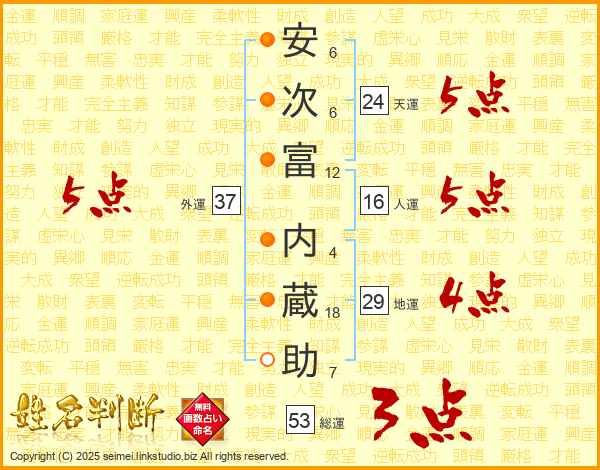 安(6画)次(6画)富(12画) 内(4画)蔵(18画)助(7画)
