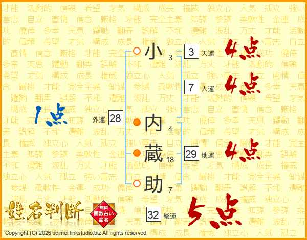 生活面を象徴する運勢です。外部から受ける影響力を表し、結婚運、家庭運や職場、環境への順応性を表します。総運から人運を引いた画数。姓や名が1文字の場合を除く。