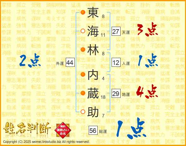 東(8画)海(11画)林(8画) 内(4画)蔵(18画)助(7画)