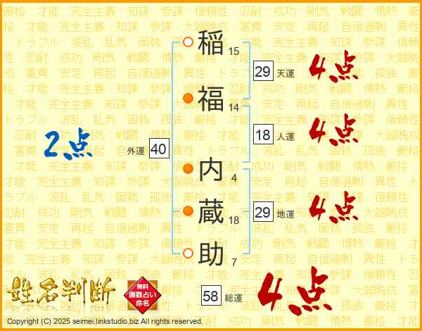 稲(15画)福(14画) 内(4画)蔵(18画)助(7画)