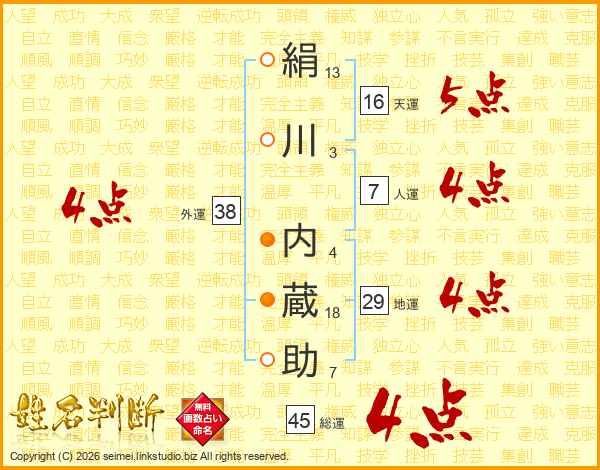 絹(13画)川(3画) 内(4画)蔵(18画)助(7画)