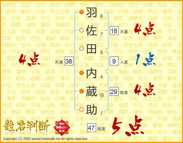 羽(6画)佐(7画)田(5画) 内(4画)蔵(18画)助(7画)