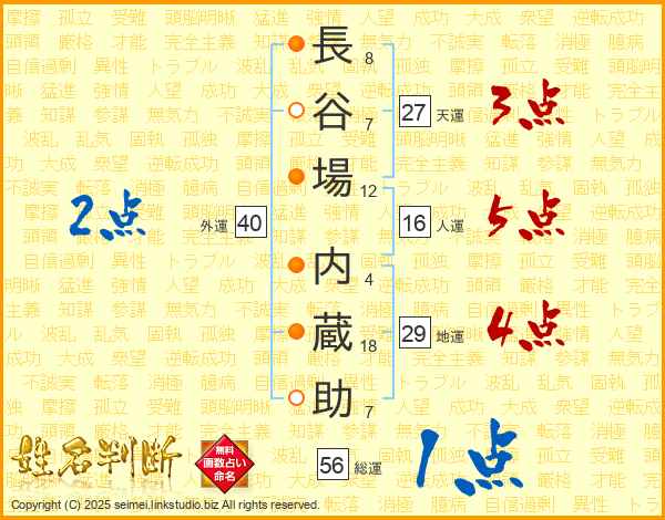 長(8画)谷(7画)場(12画) 内(4画)蔵(18画)助(7画)