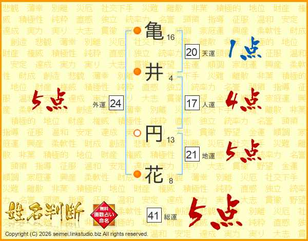 亀(16画)井(4画) 円(13画)花(8画)