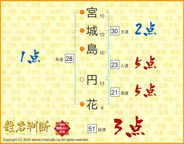 宮(10画)城(10画)島(10画) 円(13画)花(8画)