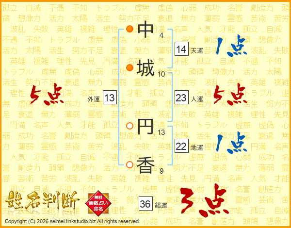 中(4画)城(10画) 円(13画)香(9画)