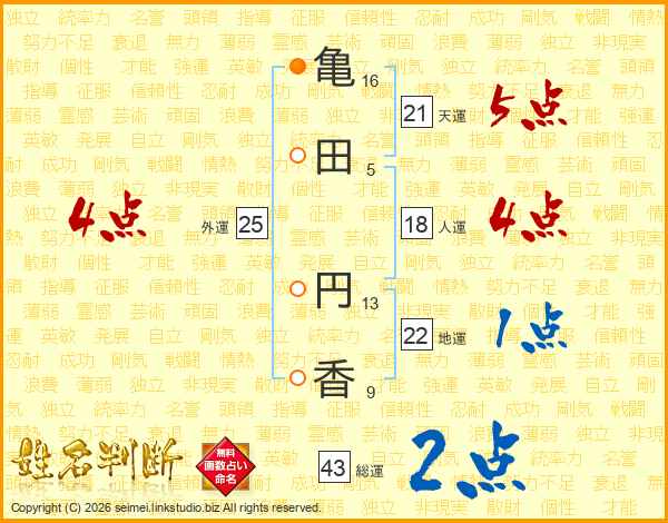 亀(16画)田(5画) 円(13画)香(9画)