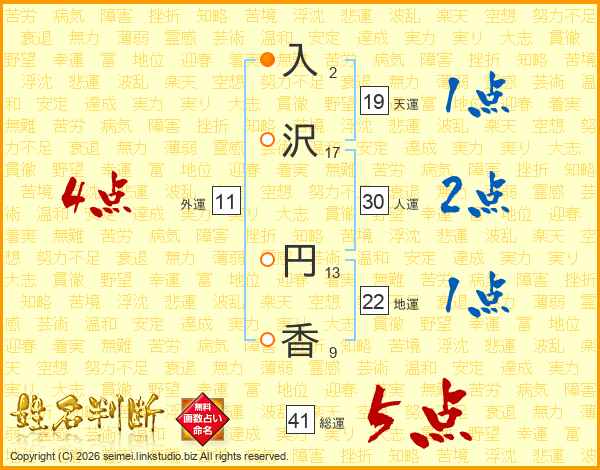 入(2画)沢(17画) 円(13画)香(9画)
