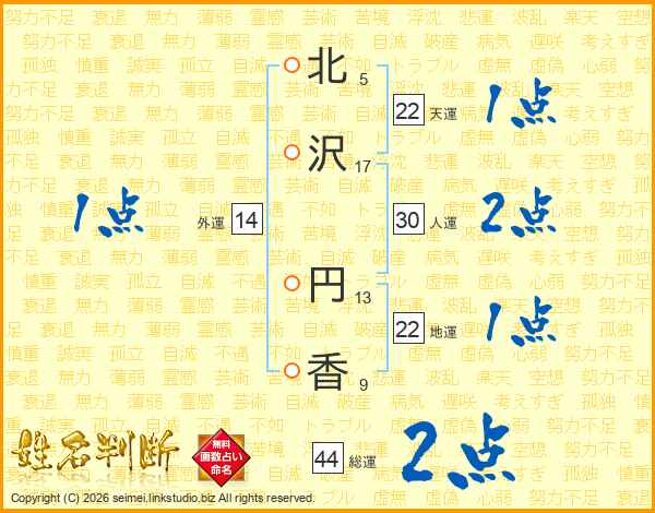 北(5画)沢(17画) 円(13画)香(9画)