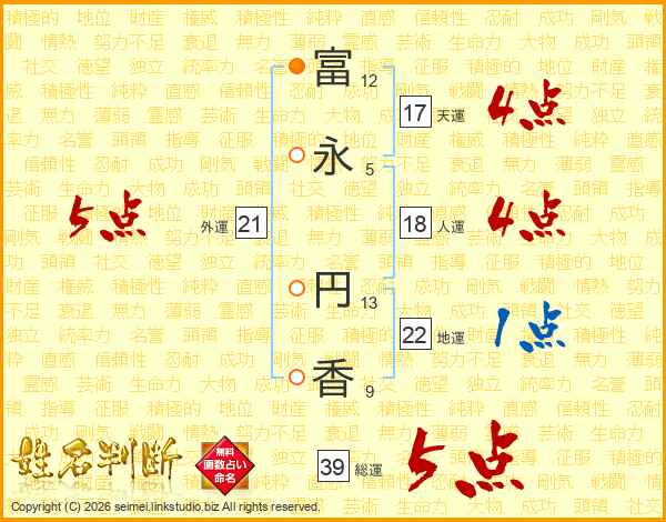 富(12画)永(5画) 円(13画)香(9画)