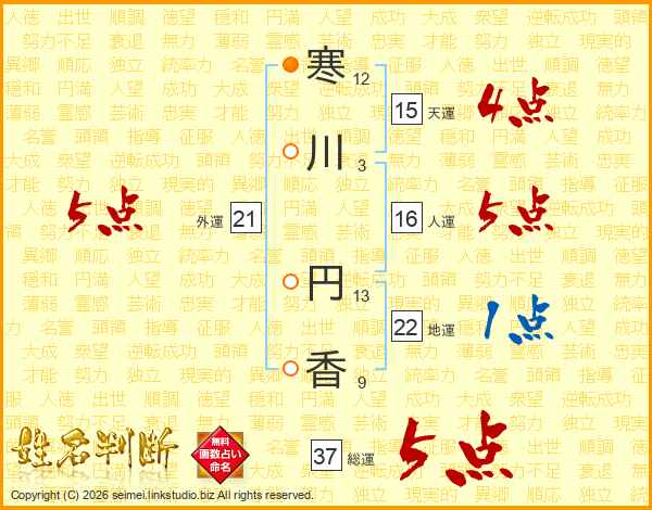 寒(12画)川(3画) 円(13画)香(9画)