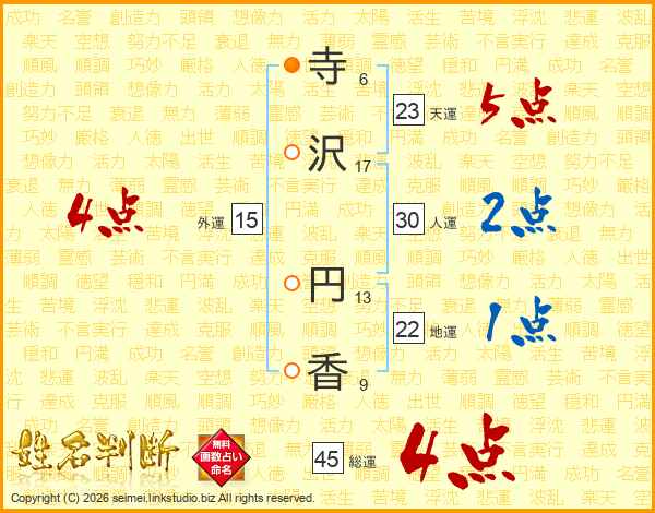 生活面を象徴する運勢です。外部から受ける影響力を表し、結婚運、家庭運や職場、環境への順応性を表します。総運から人運を引いた画数。姓や名が1文字の場合を除く。