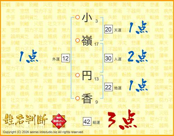 小(3画)嶺(17画) 円(13画)香(9画)