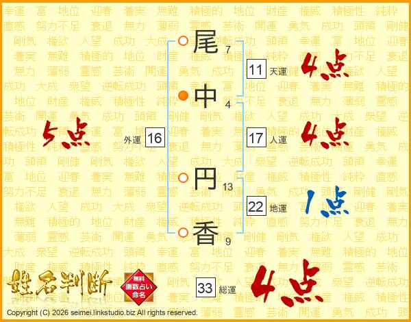 生活面を象徴する運勢です。外部から受ける影響力を表し、結婚運、家庭運や職場、環境への順応性を表します。総運から人運を引いた画数。姓や名が1文字の場合を除く。