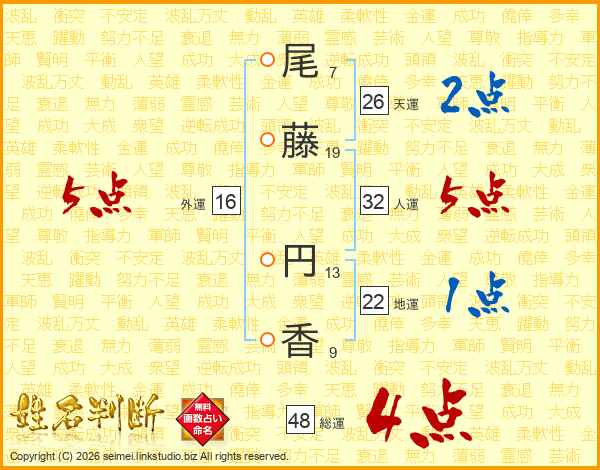 生活面を象徴する運勢です。外部から受ける影響力を表し、結婚運、家庭運や職場、環境への順応性を表します。総運から人運を引いた画数。姓や名が1文字の場合を除く。