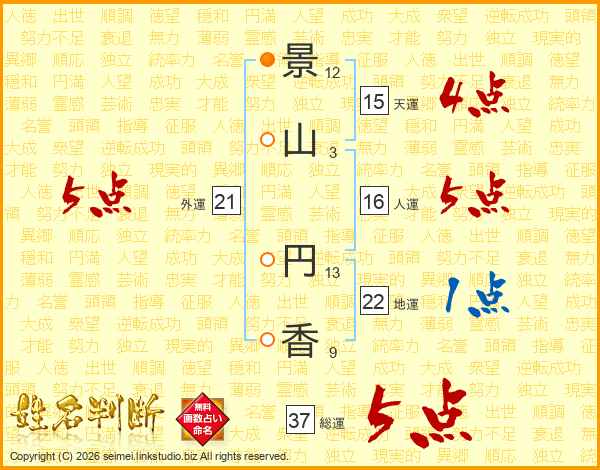生活面を象徴する運勢です。外部から受ける影響力を表し、結婚運、家庭運や職場、環境への順応性を表します。総運から人運を引いた画数。姓や名が1文字の場合を除く。