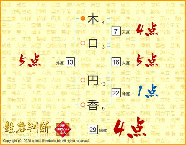 生活面を象徴する運勢です。外部から受ける影響力を表し、結婚運、家庭運や職場、環境への順応性を表します。総運から人運を引いた画数。姓や名が1文字の場合を除く。