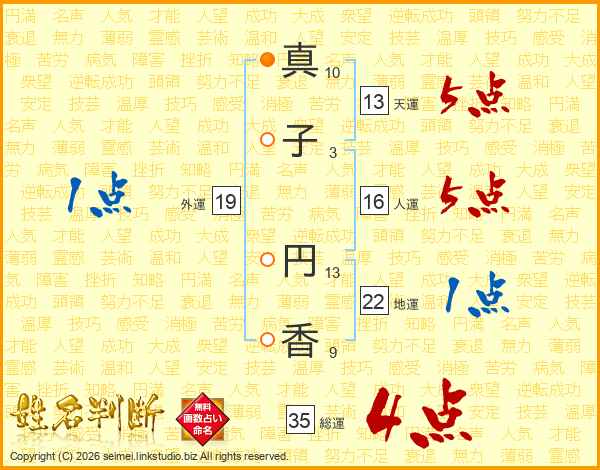真(10画)子(3画) 円(13画)香(9画)