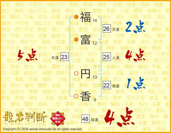 生活面を象徴する運勢です。外部から受ける影響力を表し、結婚運、家庭運や職場、環境への順応性を表します。総運から人運を引いた画数。姓や名が1文字の場合を除く。