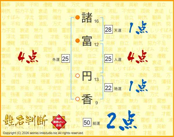 生活面を象徴する運勢です。外部から受ける影響力を表し、結婚運、家庭運や職場、環境への順応性を表します。総運から人運を引いた画数。姓や名が1文字の場合を除く。