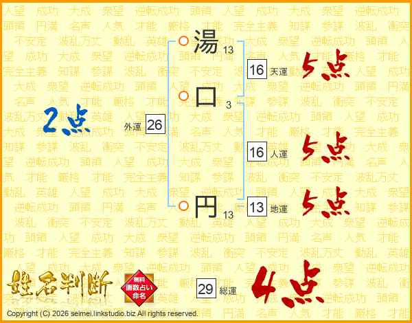 生活面を象徴する運勢です。外部から受ける影響力を表し、結婚運、家庭運や職場、環境への順応性を表します。総運から人運を引いた画数。姓や名が1文字の場合を除く。