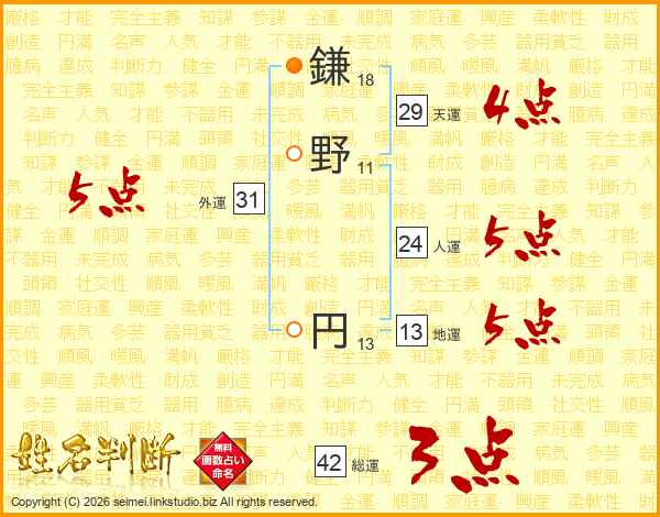 鎌野円さんの人運は24画の5点!
