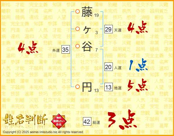 藤(19画)ヶ(3画)谷(7画) 円(13画)