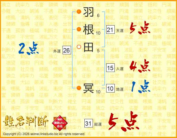 羽根田冥さんの天運は21画の5点!