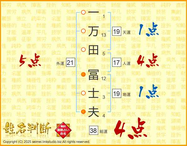 一(1画)万(13画)田(5画) 冨(12画)士(3画)夫(4画)