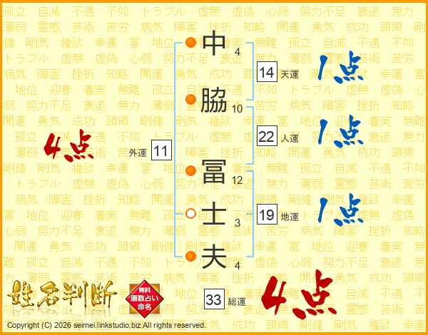 中(4画)脇(10画) 冨(12画)士(3画)夫(4画)
