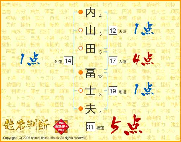 内(4画)山(3画)田(5画) 冨(12画)士(3画)夫(4画)