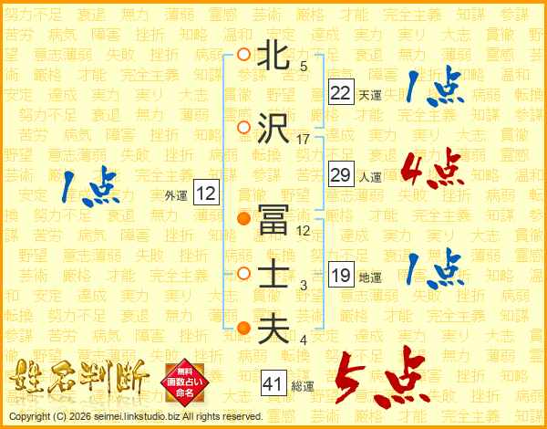 北(5画)沢(17画) 冨(12画)士(3画)夫(4画)