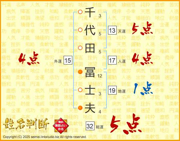 千(3画)代(5画)田(5画) 冨(12画)士(3画)夫(4画)