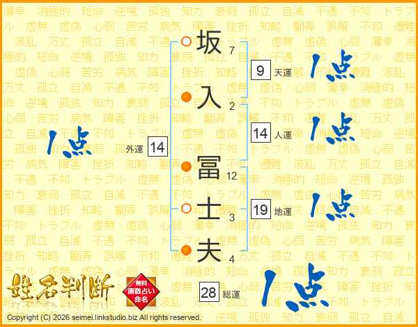 坂(7画)入(2画) 冨(12画)士(3画)夫(4画)