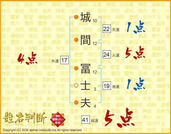 城(10画)間(12画) 冨(12画)士(3画)夫(4画)