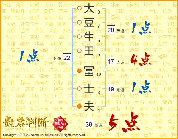 大(3画)豆(7画)生(5画)田(5画) 冨(12画)士(3画)夫(4画)