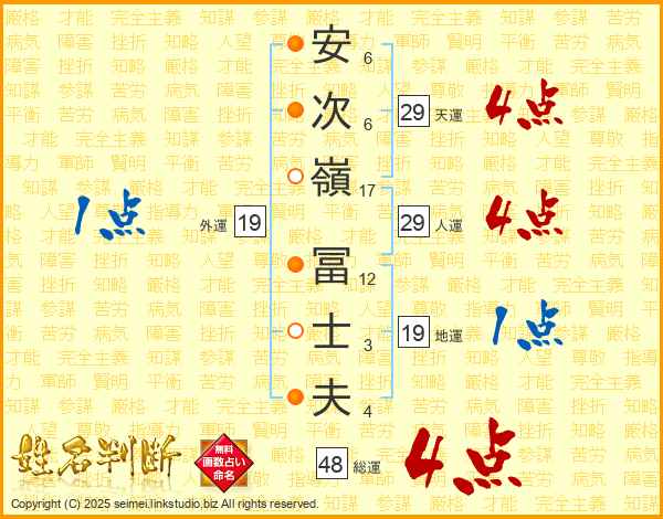 安(6画)次(6画)嶺(17画) 冨(12画)士(3画)夫(4画)