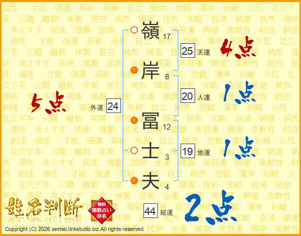嶺(17画)岸(8画) 冨(12画)士(3画)夫(4画)