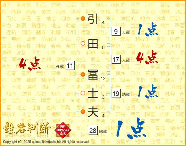 引(4画)田(5画) 冨(12画)士(3画)夫(4画)